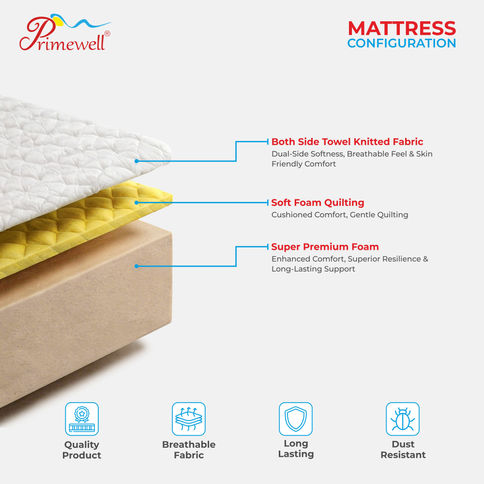 The Flexi Premium mattress combines high-density foam with advanced quilting to deliver superior comfort and support. It offers a well-balanced feel that suits different sleeping preferences. The premium fabric enhances durability and overall appeal. This Primewell mattress is ideal for users looking for a high-quality everyday mattress with a refined finish.